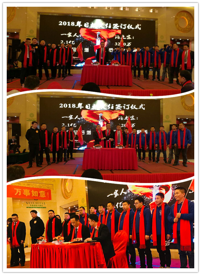 除了感恩和表彰先進,此次團拜會上還新增了一個全新的環(huán)節(jié)——誓師大會?!笆膸煷髸痹趫F拜會上體現(xiàn),這對一家人公司和泊之富公司來說,都是一種全新的體驗,同時,這也是兩家公司對2018年充滿自信的一種表現(xiàn)?!笆膸煷髸边@個環(huán)節(jié)可以說將整個團拜會的氣氛推入了高潮,展現(xiàn)了兩家公司員工斗志昂揚的精神面貌。“盡忠竭力,突破2.1億”,這是一家人銷售部全體人員響亮的誓言;“極心苦干,完成4000萬”,這是泊之富銷售部全體人員莊重的承諾。兩家公司的銷售總負(fù)責(zé)人在全體參會人員的見證下,與長沙一家人實業(yè)有限公司的總經(jīng)理李宏斌先生簽訂了目標(biāo)責(zé)任書,同時兩家公司的所有銷售人員也在廉潔承諾書上鄭重地寫上了各自的名字。